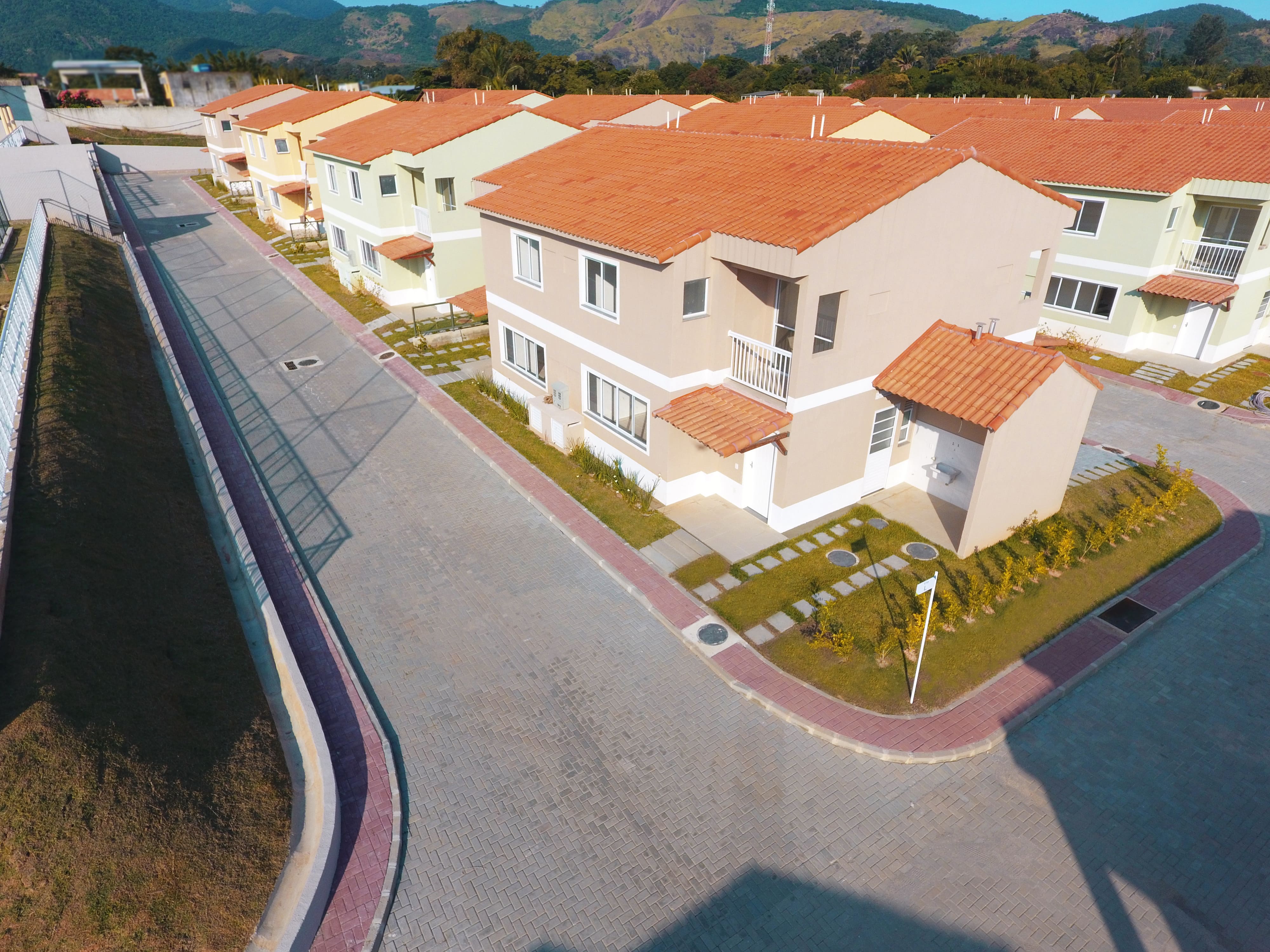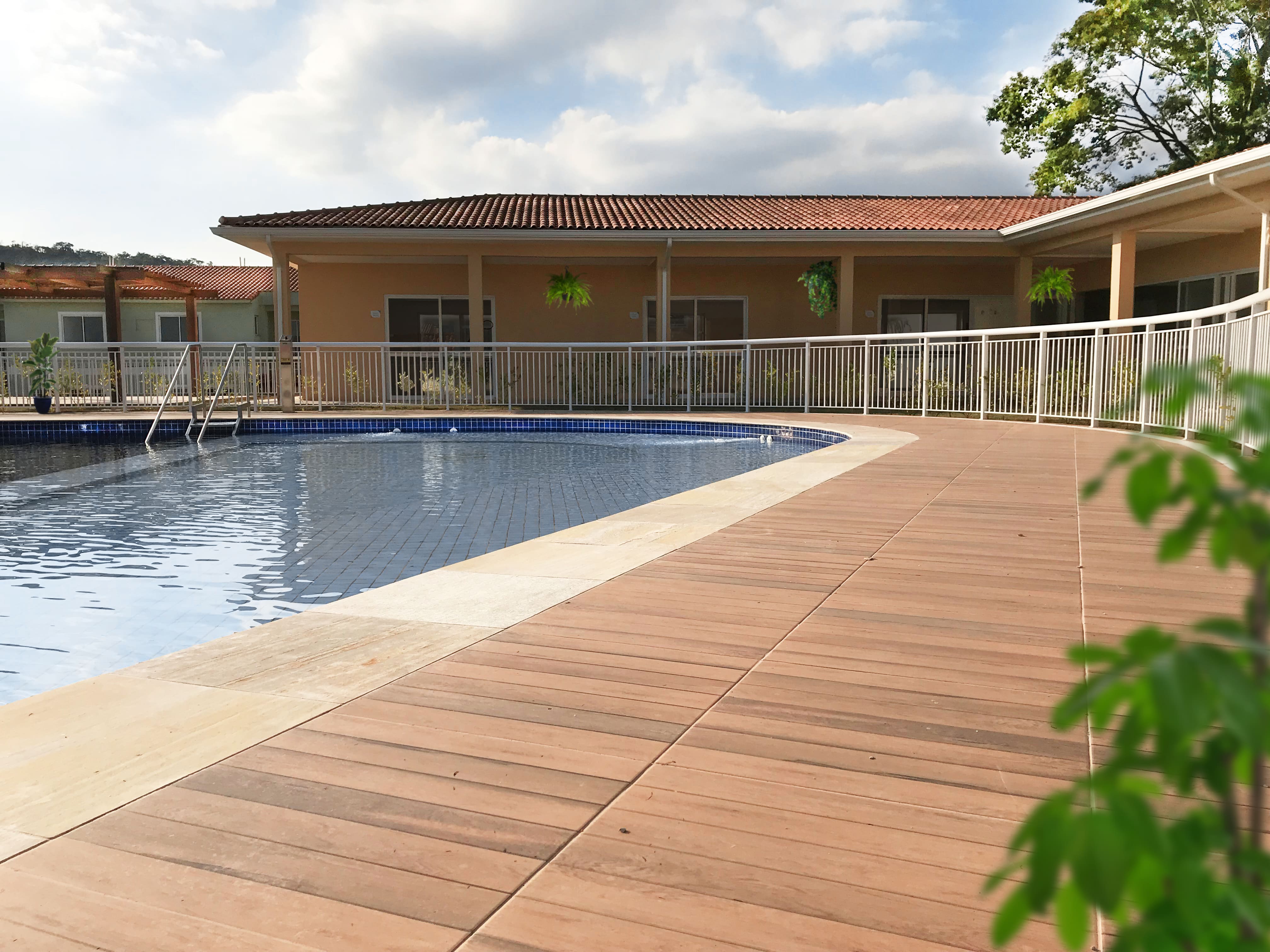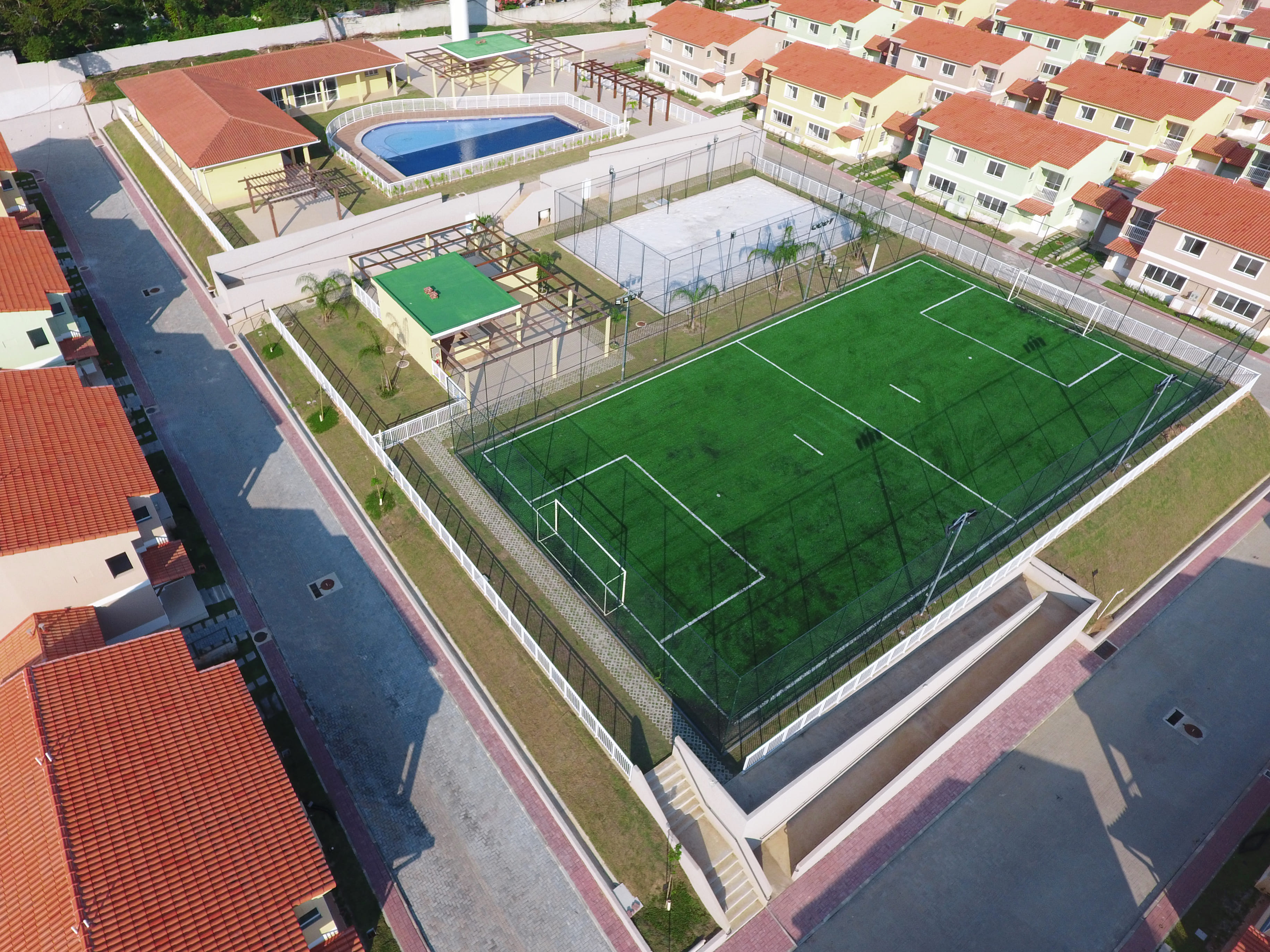Um condomínio fechado com clube exclusivo, em uma rua tranquila e arborizada.