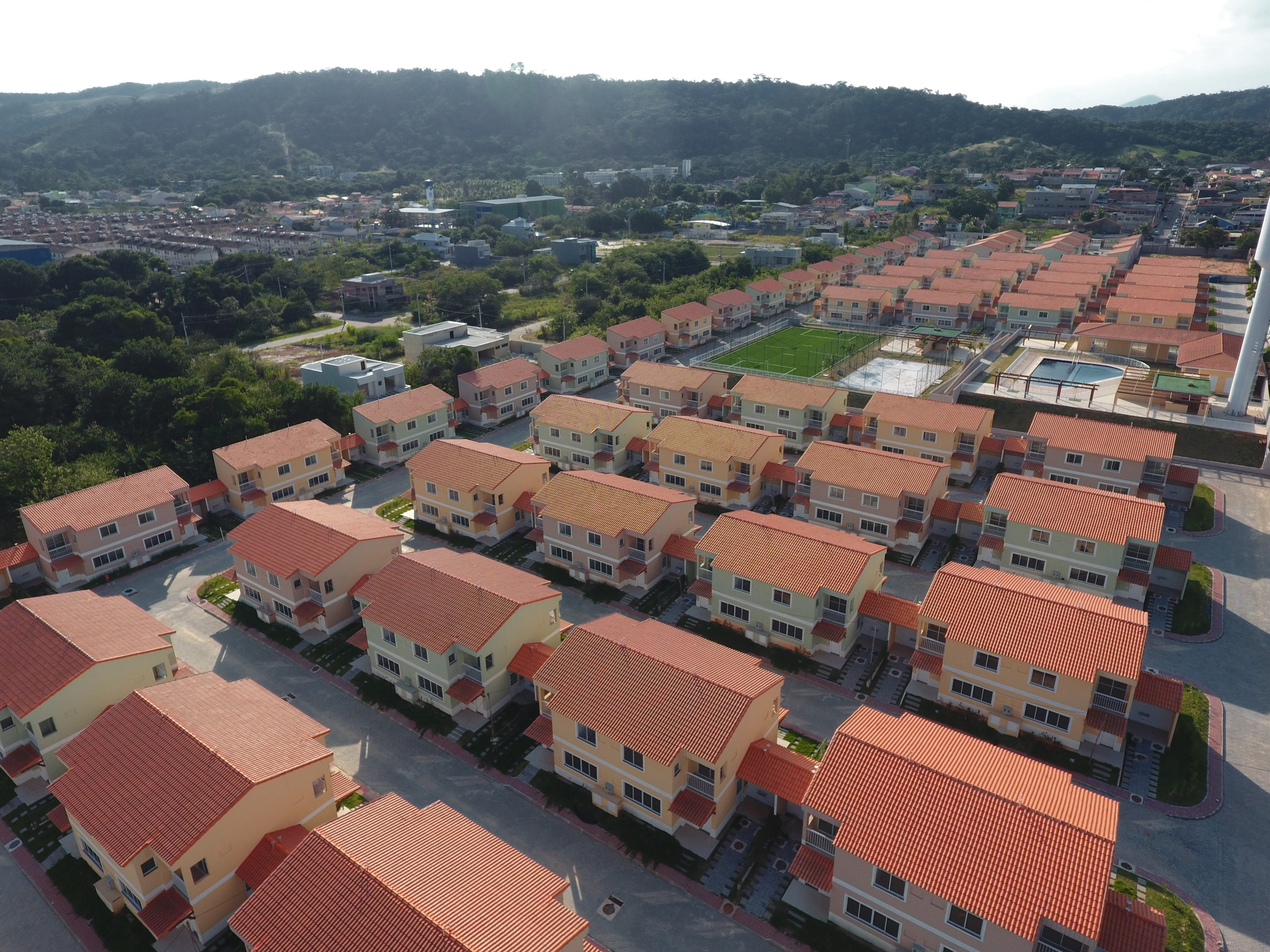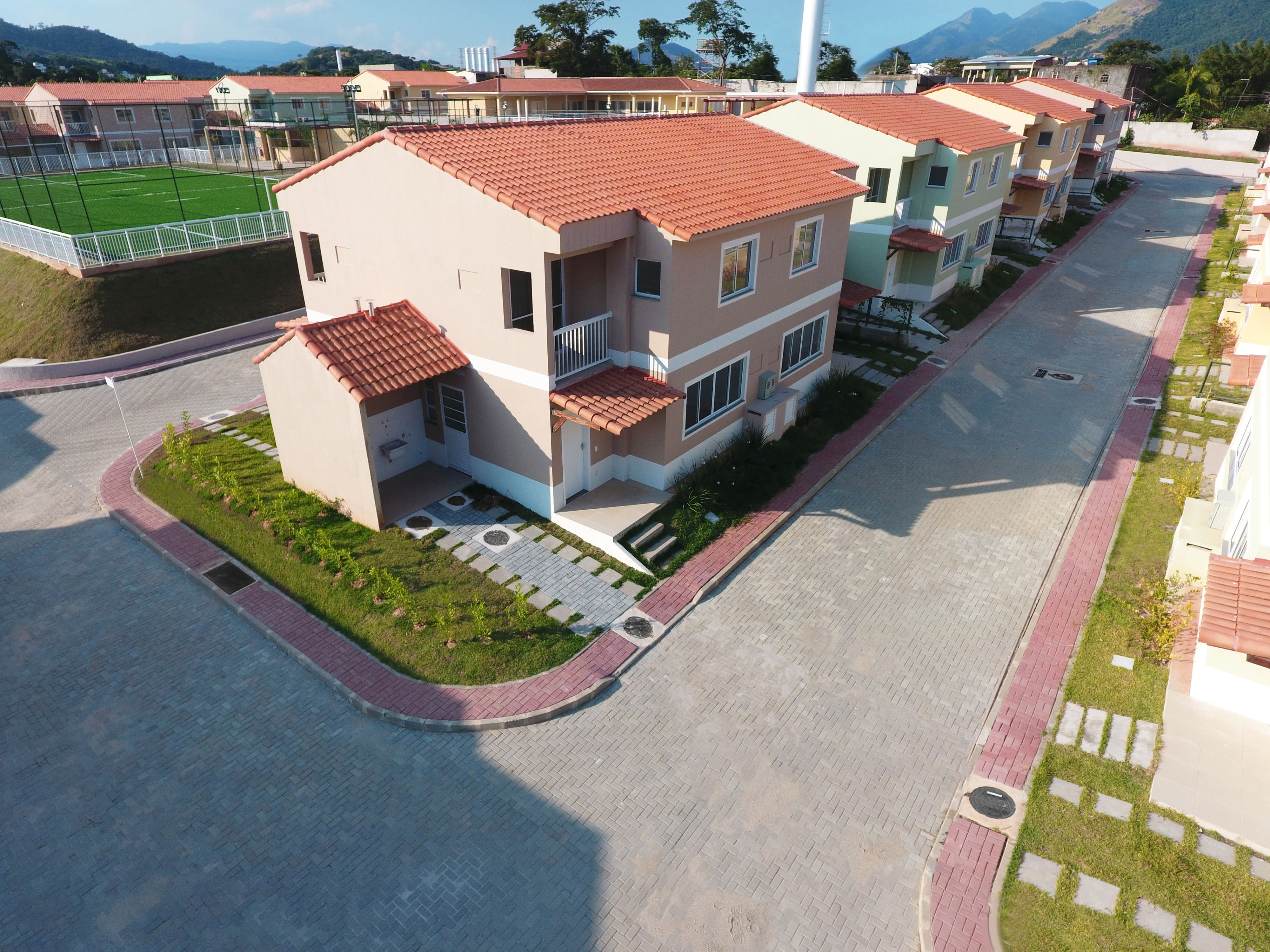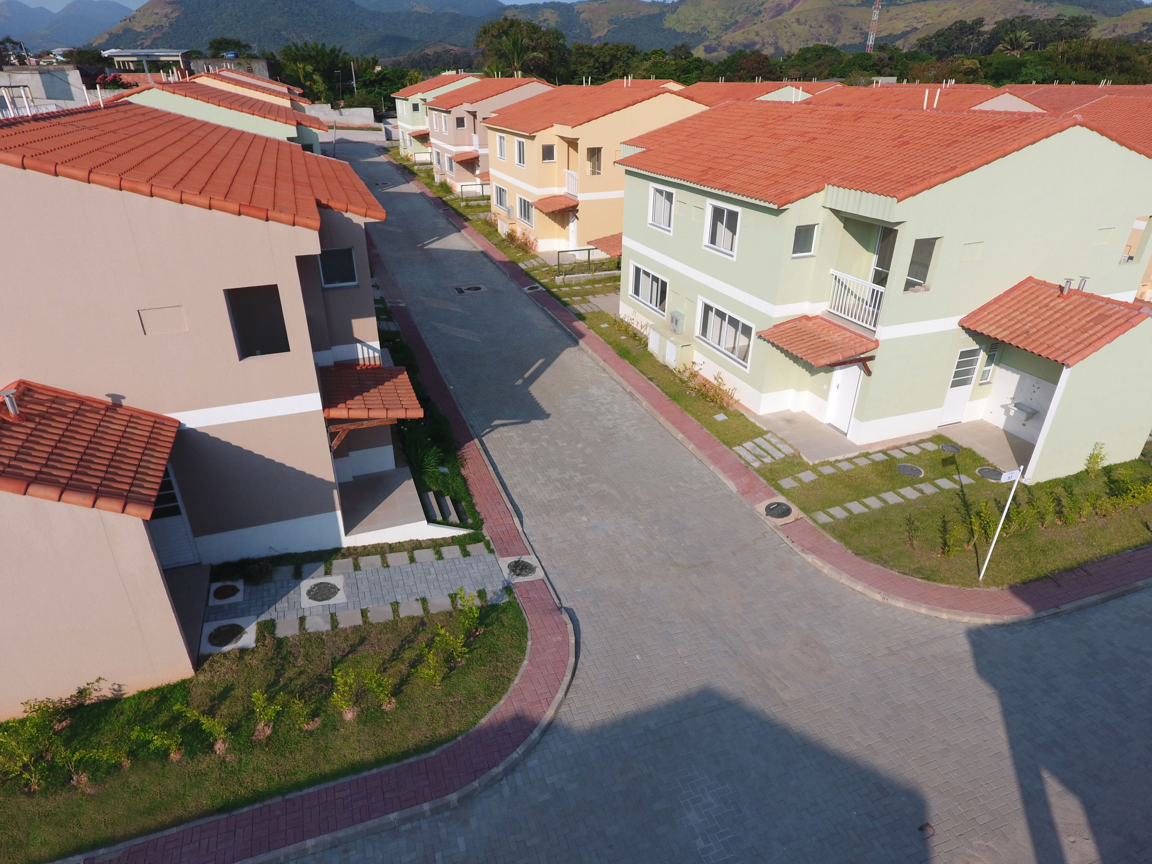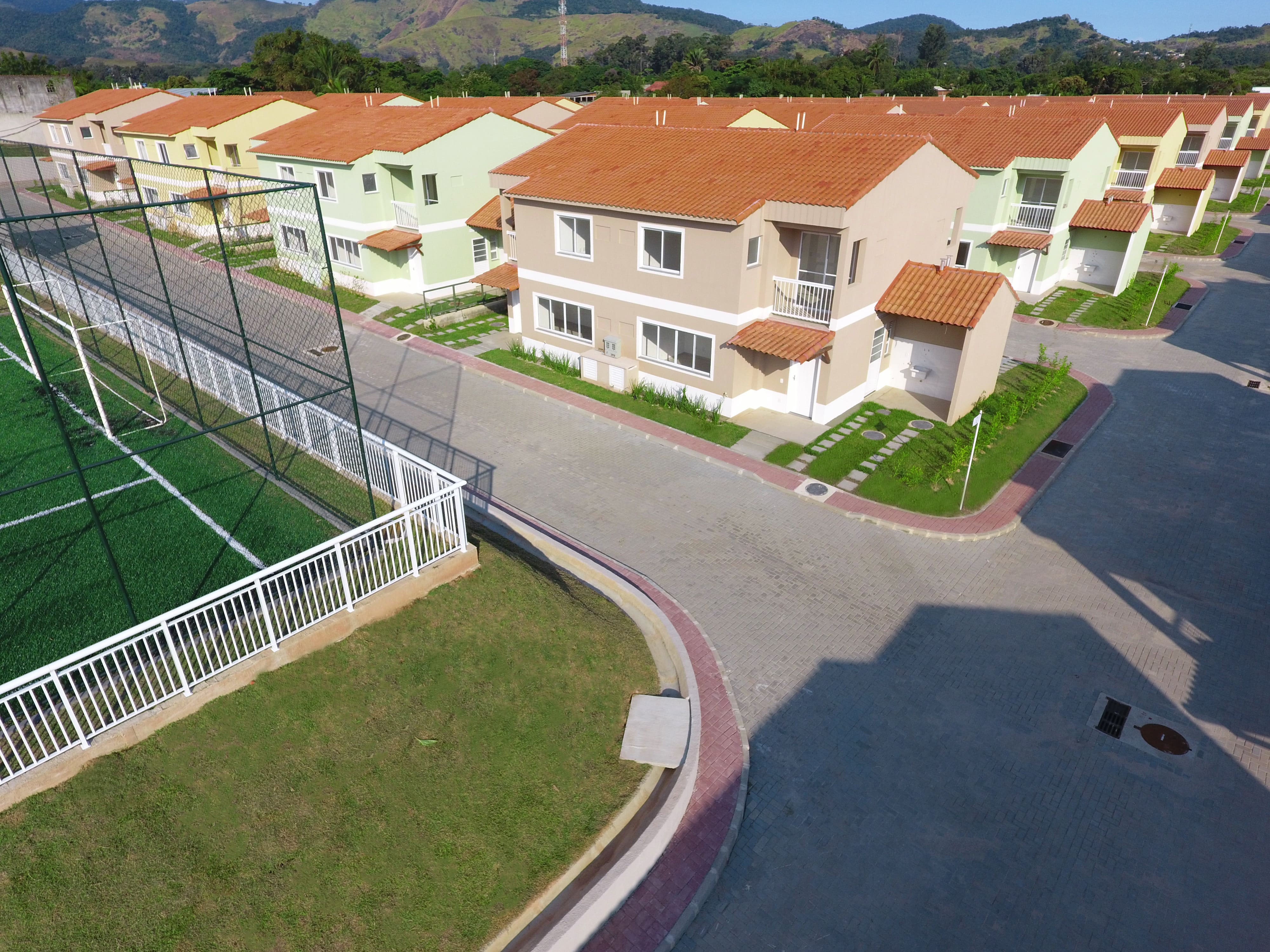 Um condomínio fechado com clube exclusivo, em uma rua tranquila e arborizada.